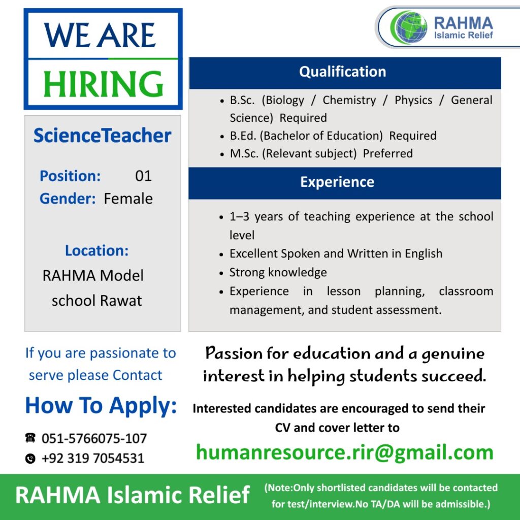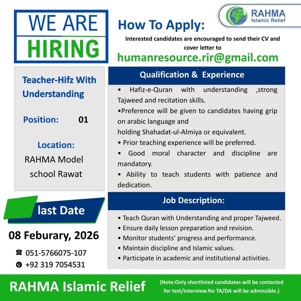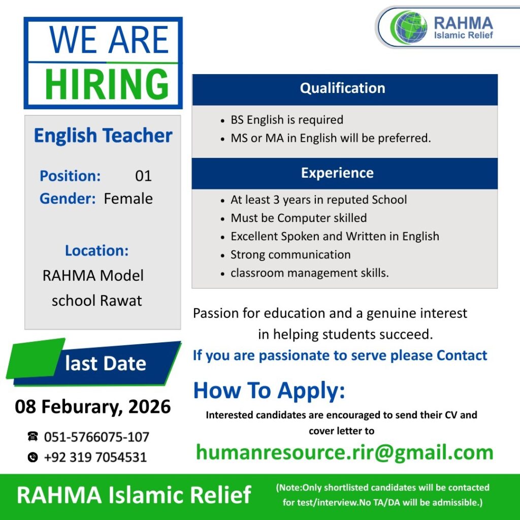 - Note : Preference will be given to those residing near Chaklala Scheme 3, and female candidates are encouraged to apply.